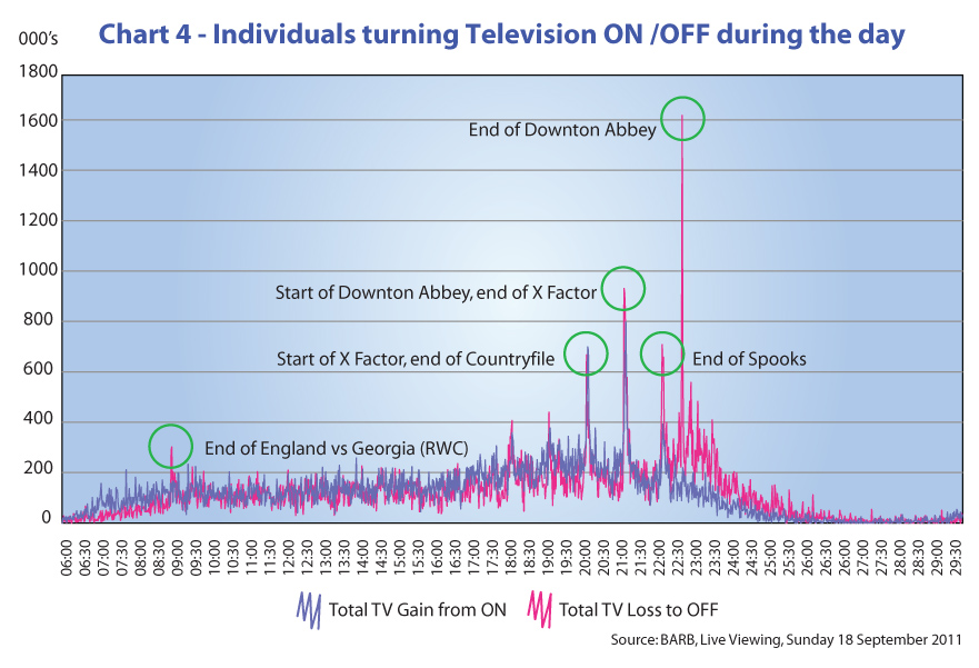 Appointments to view 19 December 2011 Barb publishes data in a form that allows flexible analysis. An example of analyses based on disaggregated data would be the use of reach and frequency models or the creation of dynamic targets based on viewing behaviours. The chart below illustrates the number of individuals (4+) turning the television on and off (or entering and leaving the room), by clock minute throughout the day. This chart identifies where audiences are both creating appointments to view their choice of programme and thereafter switching the television off (or leaving the room) after they have watched it. The chart is taken for a recent Sunday and only includes ‘Live’ viewing. The inclusion of time-shifted and catch-up viewing would increase the spikes further. Within the chart, key programmes have been identified to show the possible determinants for audiences switching the television set on and off. Within the data, it is possible to break this down by both channel and key audience demographics.